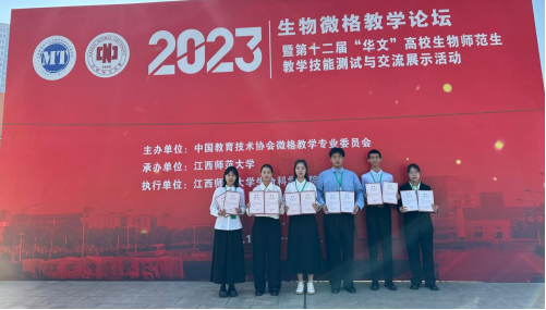 2023年10月20-23日,由中国教育技术协会微格教学专业委员会主办的第十二届“华文”师范院校生物教育师范生教学能力测试与交流展示活动在江西师范大学举行。我系生物科学专业6名选手,与来自全国130余所高校的近500名选手同台竞技,最终分获教学技能一等奖1项、二等奖1项、三等奖4项;获得教学设计三等奖5项和优秀奖1项。