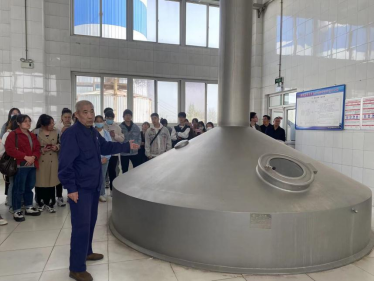 参观走访的第一站是河北蓝亨啤酒有限公司。河北蓝亨啤酒有限公司的技术人员向同学们详细介绍了啤酒酿造工艺,同学们积极与技术人员进行交流。同学们对从制麦到糖化,从发酵到灌装等的啤酒酿造工艺的认识从实验室的较小规模实验提升到啤酒厂的大规模工艺流程。