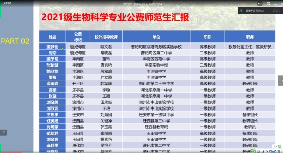 2022年11月15日,yl6809永利集团举办了2021级公费师范第二期学业汇报会。学业汇报会采用线上的方式进行。唐山市部分县区教育局领导、公费师范生校外指导教师、学生家长和系领导班子、辅导员、班主任及全体公费师范生参加了此次汇报会,2022级公费师范生观摩了会议。会议由yl6809永利集团副主任范永山教授主持。