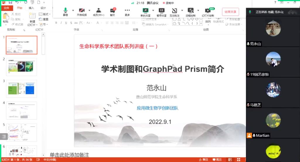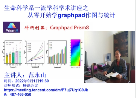 范永山主任以“从零开始学GraphPad作图与统计”为主题,重点介绍了论文发表的图片出版要求、统计学常用概念、GraphPad Prism9软件的操作流程和新功能。范主任在报告中展示了大量图片和实例,讲解生动易懂,帮助大家清晰直观地理解软件的功能应用,对教师科研工作的开展和学生毕业论文数据处理具有重要的指导作用。
