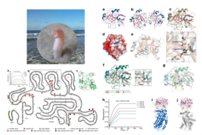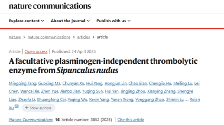 马国兴老师作为该论文的共同一作,深度参与了此项研究。研究聚焦于血栓性疾病这一全球主要健康威胁,从海洋星虫中发现了新型兼性、纤溶酶原非依赖性的溶栓酶(snFPITE),为心脑血管疾病治疗开辟了全新路径。snFPITE具有诸多优势,它既能激活纤溶酶原溶解血栓,又能直接降解纤维蛋白,对纤溶酶原正常和异常的患者均有良好疗效;其激活纤溶酶原产生的新型纤溶活性剂(Flaa)体积细小,可轻松穿透血栓,实现对血栓表面和内部的同步溶解;而且,snFPITE能将纤维蛋白降解为超细小肽片段,显著加快溶栓周转速度;与传统的PA 和纤溶酶相比,它仅受到纤维蛋白溶酶原激活物抑制剂1(PAI 1)和2 -抗纤溶酶(a2AP)的轻度抑制,在血液循环中稳定性更高。