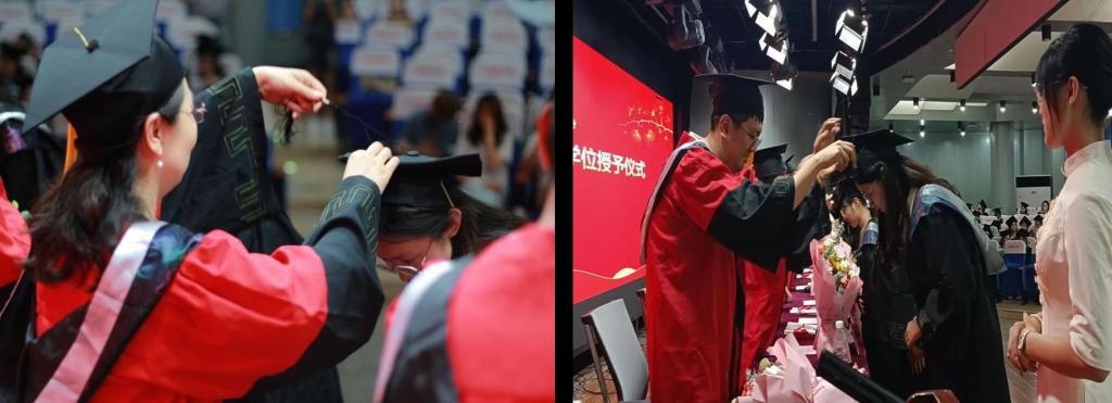 典礼结束后,主席台的领导老师为毕业生们拨穗正冠,授予学位。