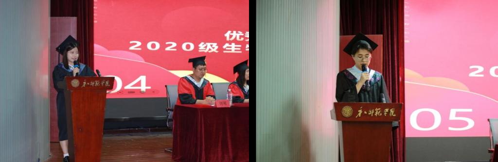 毕业生代表、在校生代表、教师代表相继发言。优秀毕业生代表、2020级生物技术班范迎雪,优秀考研学生代表、2020级生物科学班段鑫源分享了自己在生科学习、生活印象深刻的点滴记忆,并表示将牢记“厚德博学,实践创新”的系训,做怀揣梦想、脚踏实地的人,做拥有智慧,富有激情的人、做德才兼备,敢挑重担的人,以青春之名,赴时代之约。
