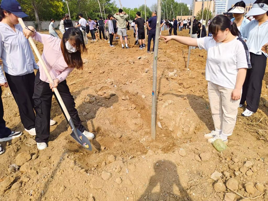 活动伊始,由后勤基建处的老师为大家进行植树讲解,随后,各院系师生按照种植分配区域进行义务植树活动。活动中,全体师生分工明确,相互协作,一起刨坑测距,树苗入穴,扶正填土、踩实浇水,不怕苦,不怕累。经过几个小时的辛勤劳动,师生们共同为校园增添了一片片绿意。活动的最后,大家纷纷和自己亲手栽种的树苗合影留念。
