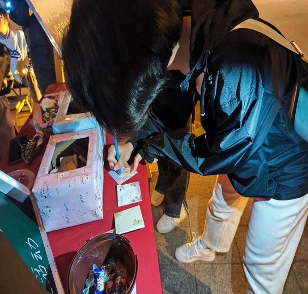 在工作人员的精心安排和组织下,同学们按时到达活动地点,在便笺上写下自己的焦虑或烦恼,对折后投递到“焦虑盲盒”中,同时在“安慰盲盒”中抽取一张便签,进行心情交换。由此,帮助同学们进行烦恼的消解与正能量的传递。