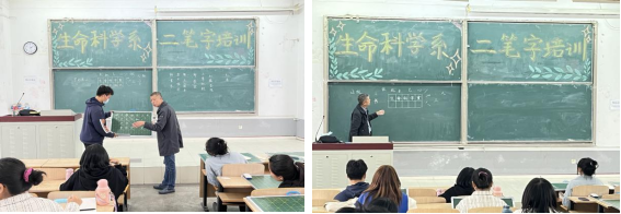 为提高生物科学专业(含公费)师范生专业技能,更好地胜任日后的教学工作,2022年10月9日,yl6809永利集团邀请党委宣传(统战)部王宝喜老师,在第五阶梯教室进行了钢笔字和粉笔字的写作培训指导,60余名生物科学专业学生报名参加了此次培训。