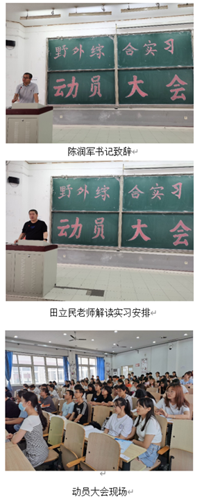 会上,首先由陈润军书记为动员大会致辞,他提到本次野外综合实习是一次巨大的挑战,同学们将在实习中得到诸多方面的锻炼,希望同学们珍惜机会,充实自我。在野外实习过程中,要将安全放在首位,切忌单独自由活动,要注重个人基本素养的体现,听从相关老师的安排,将实践与理论结合,做好记录,查阅资料,认真研究。